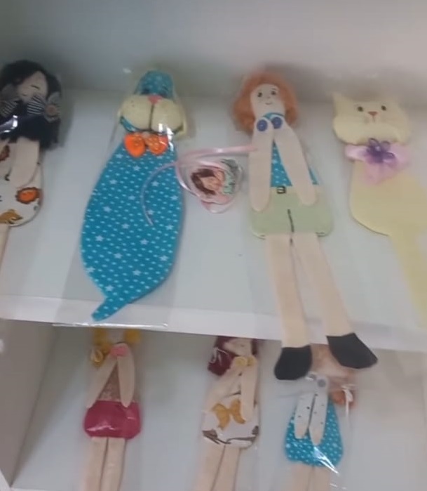 • Varais de Bonecas: Algumas peças ficam penduradinhas por pequenos prendedores de madeira, balançando suavemente com o vento, como se estivessem brincando.